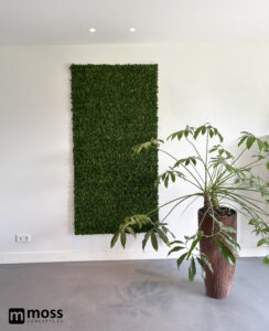 Overweeg ook een moswand boven een bank, naast een haard of als opvallend element in een open ruimte. Zelfs een smalle strook langs een trapwand of in de hal kan een krachtig visueel statement maken.